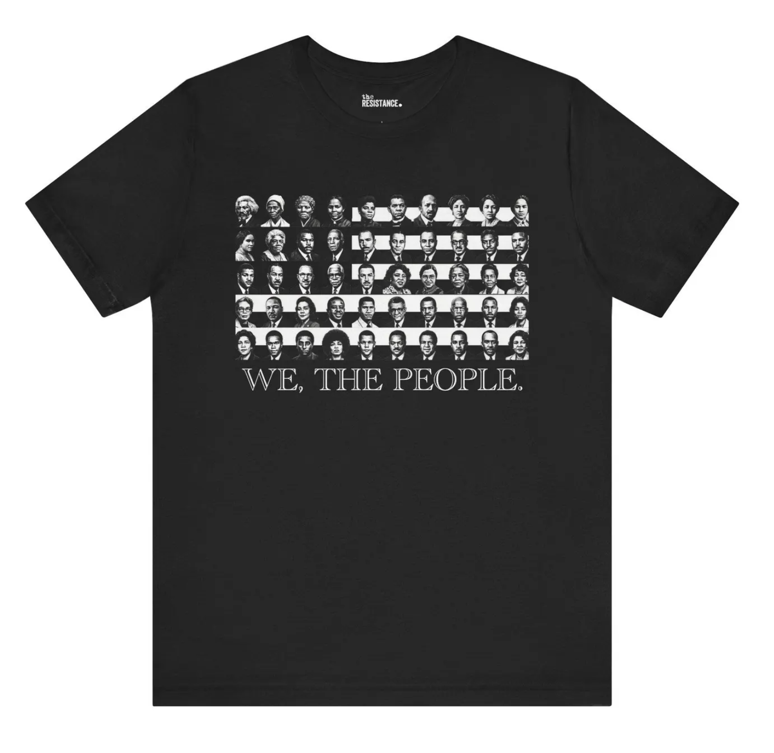 This image shows a black theRESISTANCE t-shirt with a bold graphic that transforms the American flag into a tribute to Black history and freedom work. Instead of stars and stripes alone, the design is built from rows of black-and-white portraits of Black abolitionists, organizers, intellectuals, and civil rights leaders. The phrase “WE, THE PEOPLE.” anchors the bottom of the design, reinforcing the message that democracy, rights, and belonging were expanded through Black struggle and persistence. The overall look is clean, powerful, and conversation-starting—part protest art, part historical tribute, and fully aligned with the brand’s message of wearable conviction.